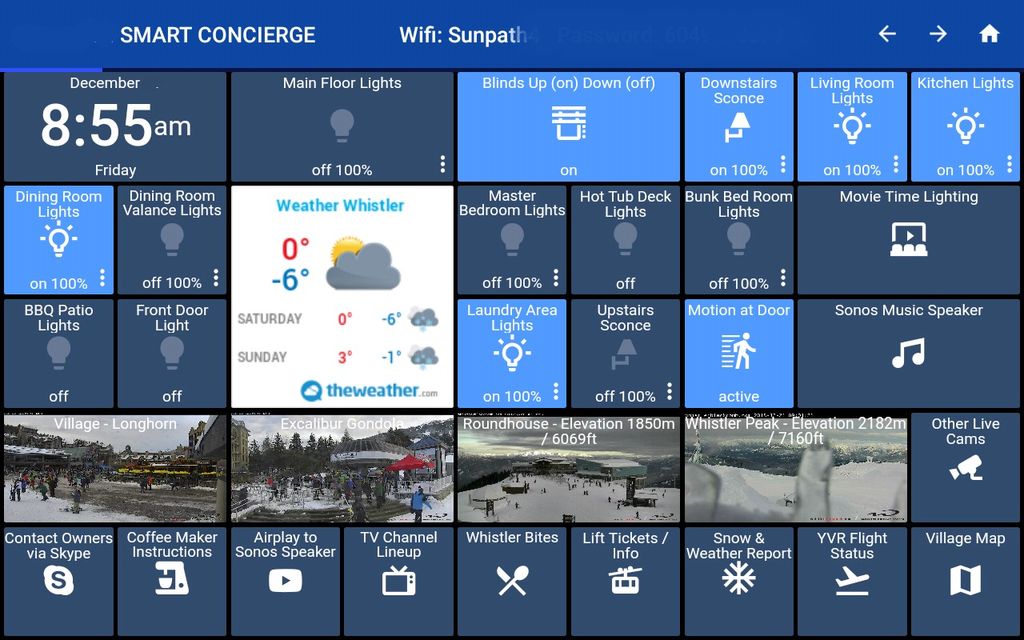 There is a Samsung tablet on the counter which will serve as your smart concierge, you will be able to control all the lighting, blinds, etc. and also provides you information about our place, the village, and mountain. When not in use, please place it back on the stand and plug it in so it stays charged.